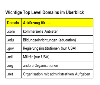(.net) oder wirtschaftliche Institutionen (.com). Jede Top Level Domain enthält weitere Bereiche (Second Level Domains). Eine Second Level Domain kann beispielsweise ein Institut, eine Firma oder eine Organisation sein. |